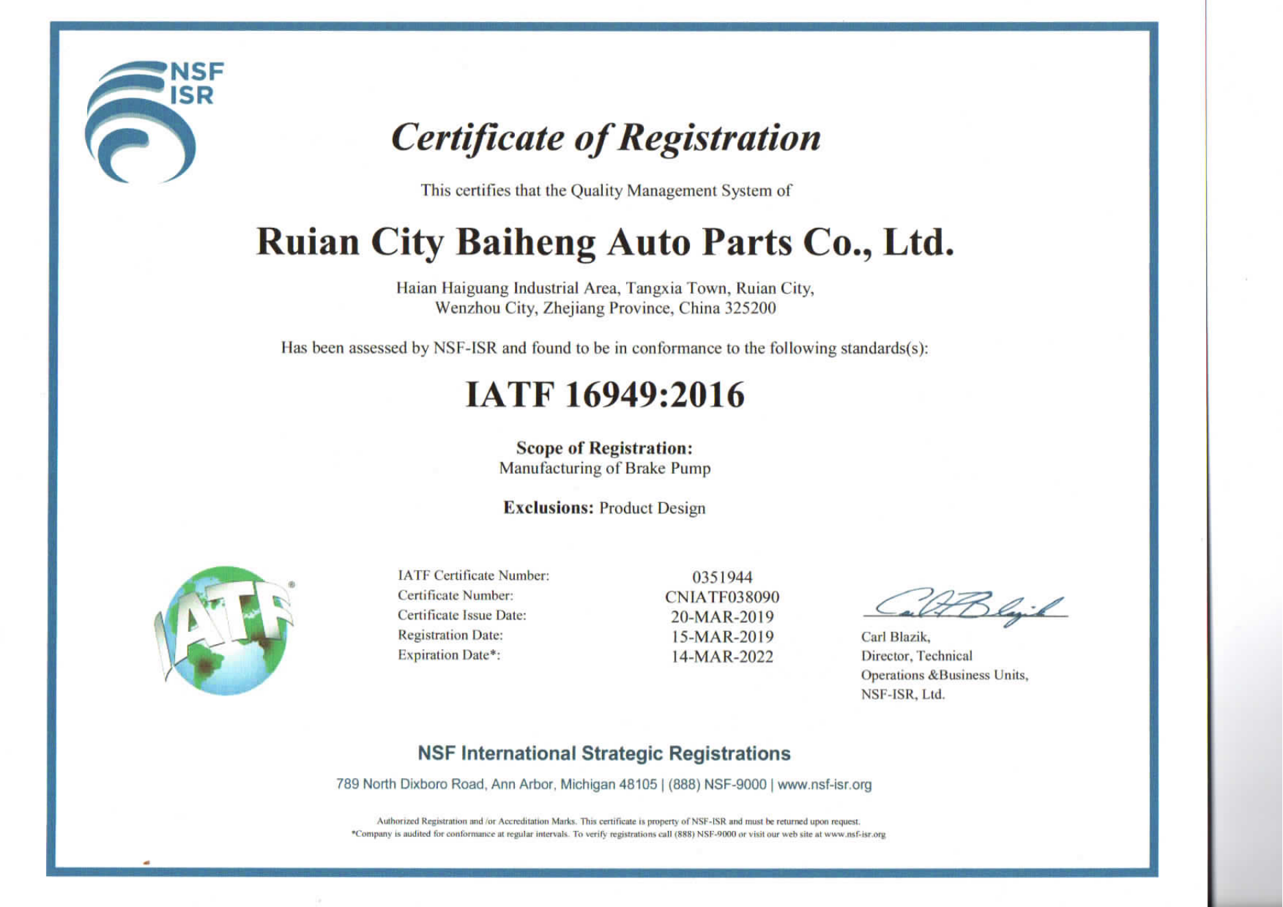 OEM经验 证书 IATF 16949,ISO14001